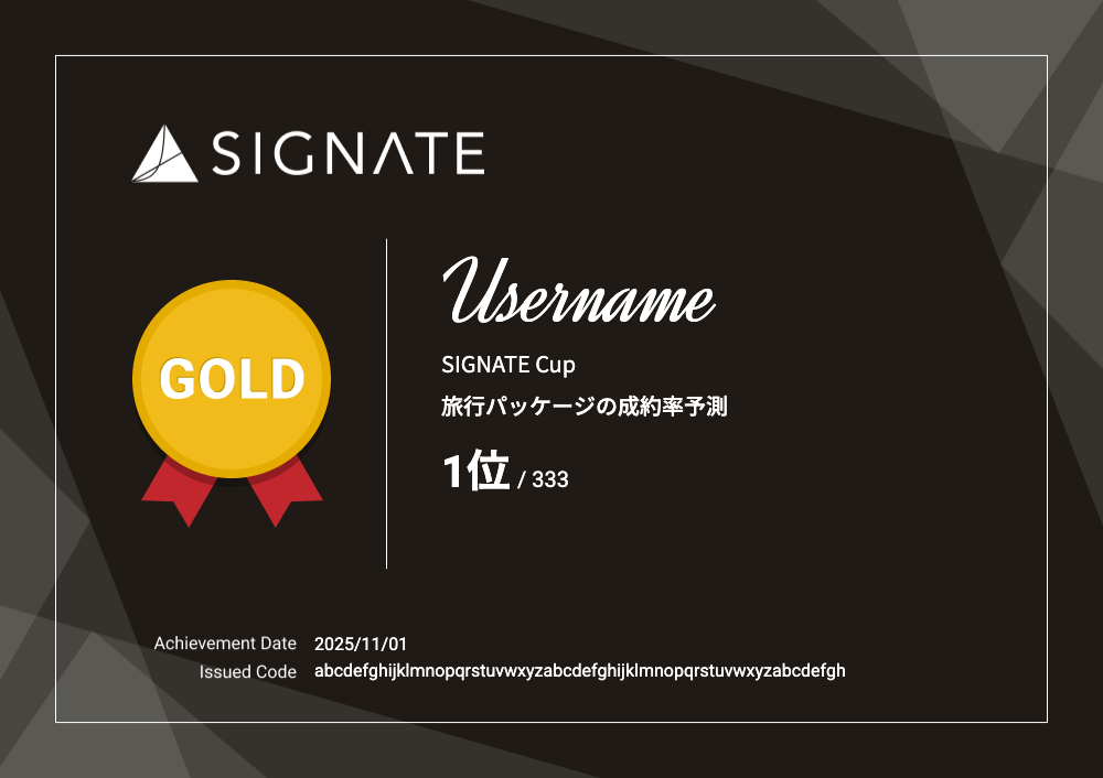 SIGNATE will issue official certificates to users who achieve outstanding results in competitions. Share your certificates on social media to showcase your competition achievements and new skills.