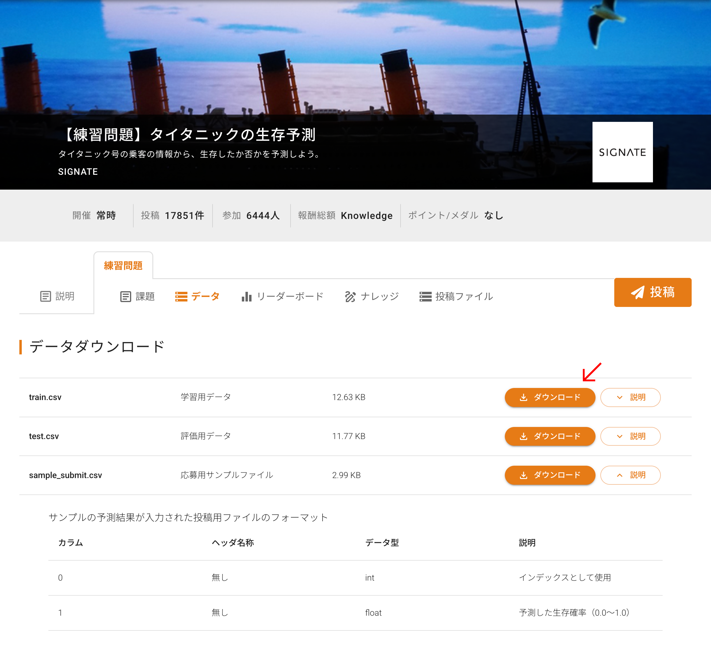 各コンペページの「データ」タブからダウンロードできます。