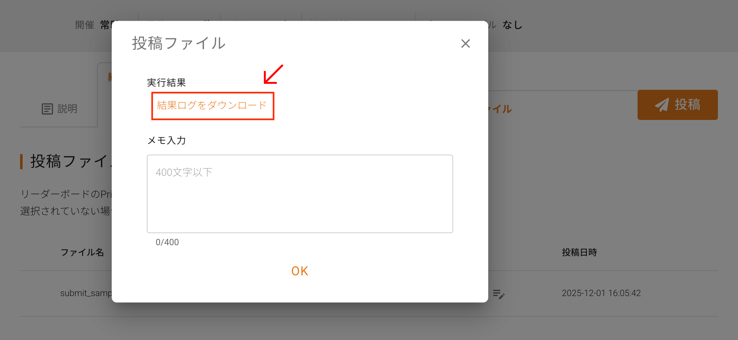 エラーの詳細を確認するには、メール本文のリンクからコンペの「投稿ファイル」タブにアクセスしてください。